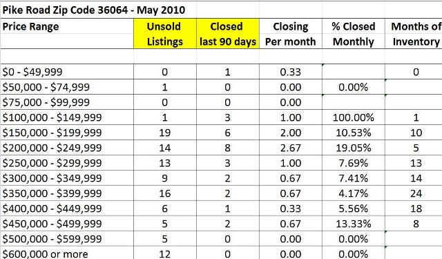 September 2010 home sales for Zip Code 36064 for Pike Road and eastern Montgomery County including subdivisions Woodland Creek, Bridle Brook, Avalon, Merrywood, Foxwood and The Waters.How to use: Find the Price Range in which your home falls. This will show the number of active listings (your competition), the number of homes that closed in the last 90 days, the number of homes that close on average in a month, the Percentage Closed Monthly (the likelyhood that one home will close in a month), and the Months of Inventory (how many months worth of homes to sell if no other homes come on the market). For a personalized report, feel free to contact me.