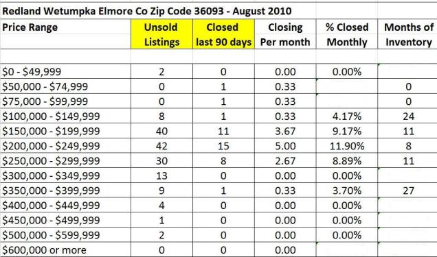 August 2010 home sales for Zip Code 36093 in Redland, Wetumpka and Elmore County includes subdivisions Emerald Mountain, Blue Ridge, Mitchell Creek Estates, Grand Ridge, Jasmine Hill, Stonegate, Windsong Ridge, Wildwood, Harrogate Springs, Jackson Trace, and Brookwood. How to use: Find the Price Range in which your home falls. This will show the number of active listings (your competition), the number of homes that closed in the last 90 days, the number of homes that close on average in a month, the Percentage Closed Monthly (the likelyhood that one home will close in a month), and the Months of Inventory (how many months worth of homes to sell if no other homes come on the market). For a personalized report, feel free to contact me.