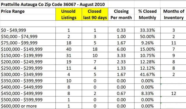August 2010 home sales for Zip Code 36067 in Prattville and Autauga County including subdivisions Camellia Estates, Live Oak, The Oaks of Buena Vista, Aspen Ridge, Bridge Creek Reserve, and Hearthstone.How to use: Find the Price Range in which your home falls. This will show the number of active listings (your competition), the number of homes that closed in the last 90 days, the number of homes that close on average in a month, the Percentage Closed Monthly (the likelyhood that one home will close in a month), and the Months of Inventory (how many months worth of homes to sell if no other homes come on the market). For a personalized report, feel free to contact me.